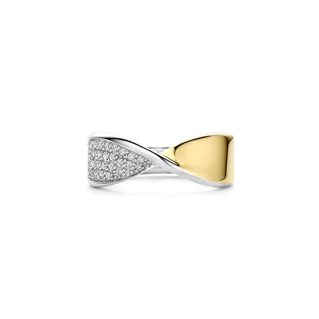 Maak een strak statement met deze TI SENTO goudkleurig vergulde zilveren ring 12393ZY. Vervaardigd uit 925 sterling zilver, wikkelt dit sculpturale design zich in een gedurfde twist om de vinger: de ene helft goudkleurig verguld, de andere helft platinakleurig verguld en pavé-gezet met briljant geslepen witte cubic zirconia. De diagonale lijn tussen glans en schittering creëert een dynamisch samenspel van contrast en beweging, perfect voor wie houdt van verfijnde impact. Draag hem solo als eyecatcher, of combineer hem met minimalistische ringen voor een moderne gelaagde look. Nikkelvrij en hypoallergeen, deze ring biedt blijvend comfort en een elegante afwerking bij elke gelegenheid.
