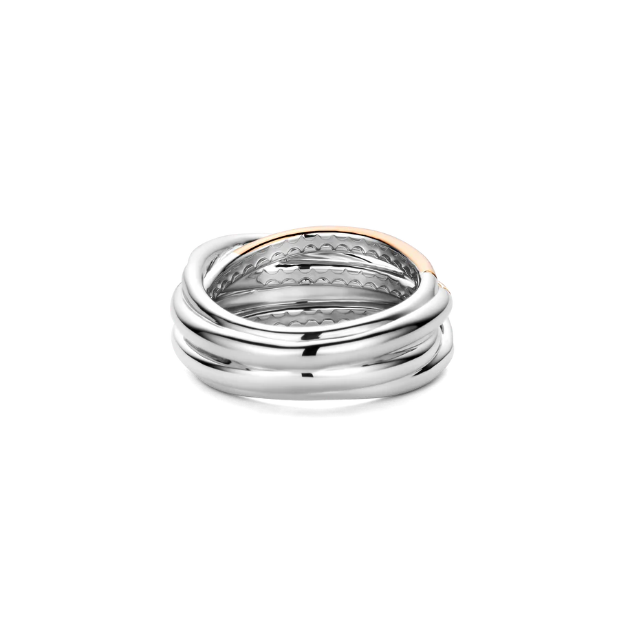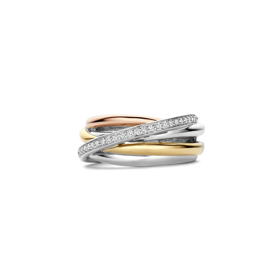 Omarm moderne harmonie met deze TI SENTO driekleurige ring 12318ZT. In elkaar gevlochten banden vormen een kunstzinnig ritme van stralend geelverguld, zacht roséverguld, zilver en een schitterend pavé van cubic zirconia, allemaal vervaardigd uit 925 sterling zilver. Een rij briljant geslepen witte cubic zirconia siert één van de banden en geeft extra licht en diepte zonder het ontwerp te overheersen. Draag deze ring solo als opvallend statement of combineer hem met verfijnde stapelringen voor een persoonlijke look. Met zorg vervaardigd voor de gevoelige huid, is deze nikkelvrije en hypoallergene ring ontworpen voor blijvend comfort en kwaliteit.