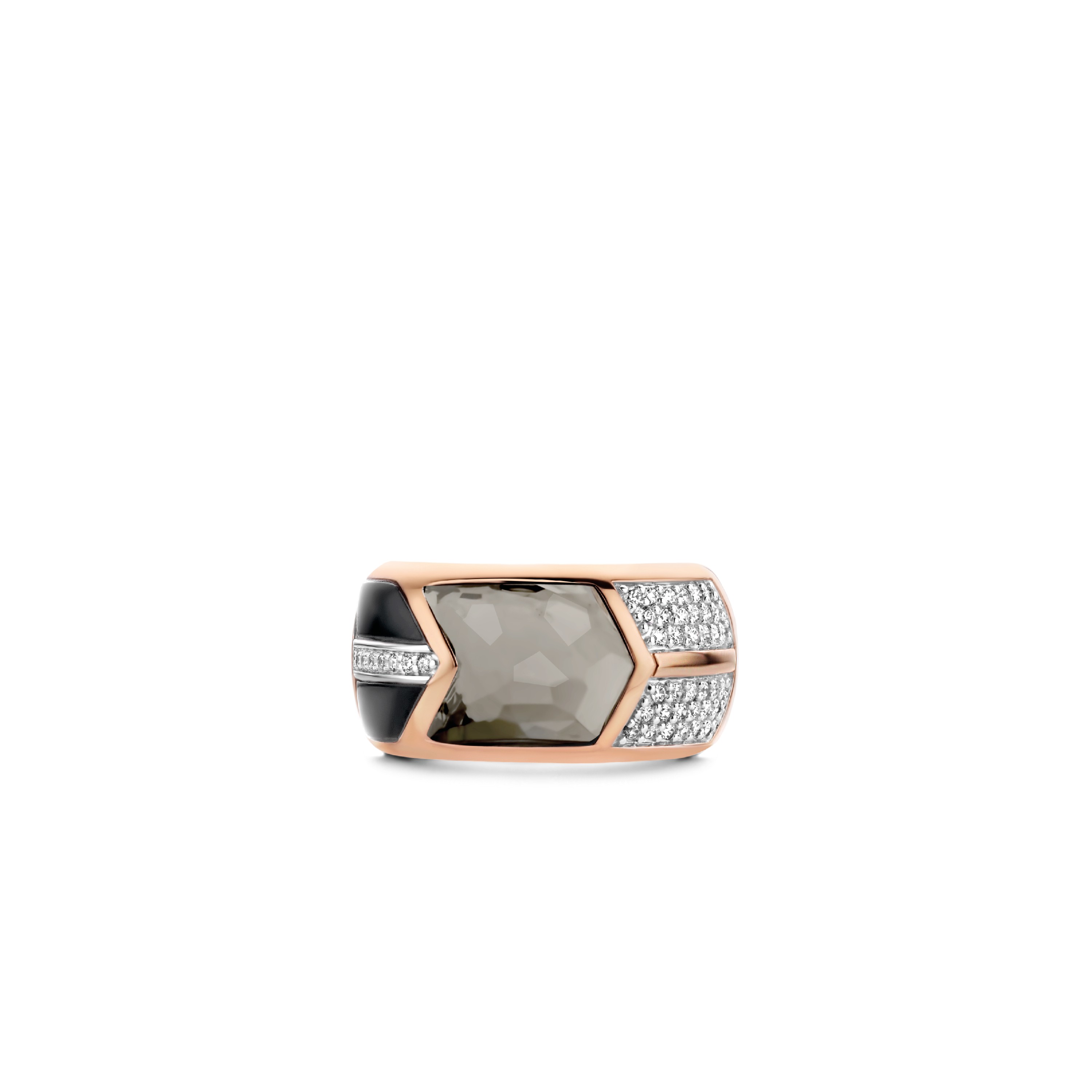 Deze ronde zilveren TI SENTO 12204GB ring heeft grijze en zwarte onyxstenen die met de hand zijn gezet in een roségouden plating setting. De witte zirkonia afwerking voegt dat verfijnde vleugje extravagantie toe.