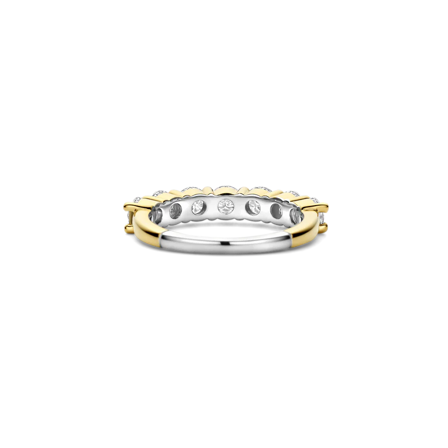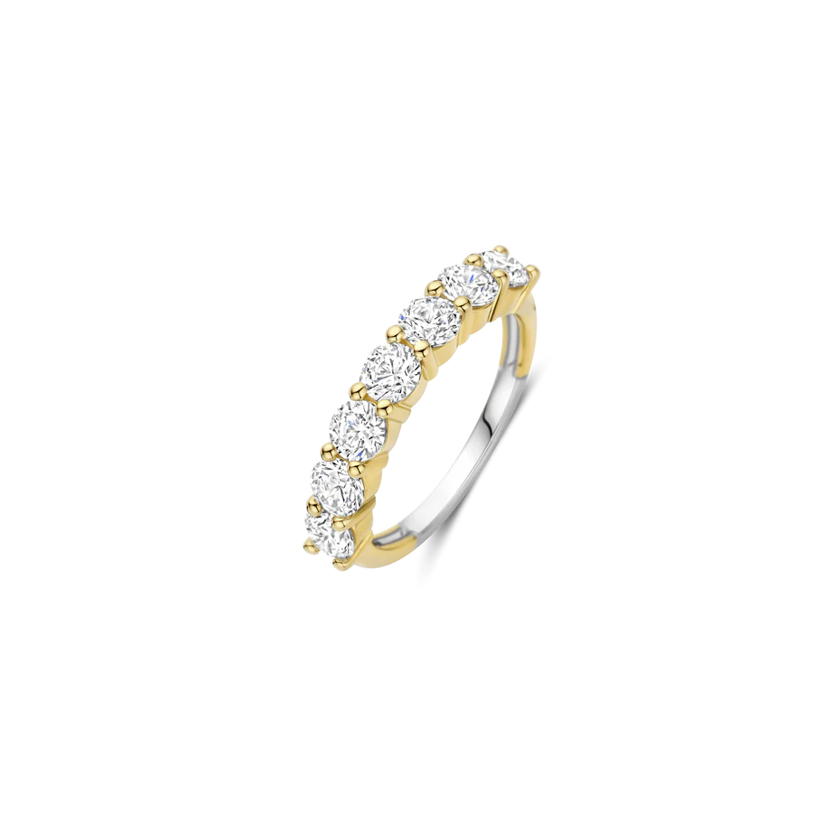 Geniet van stralende verfijning met deze TI SENTO goudkleurig vergulde zilveren ring 12380ZY. Gevormd uit 925 sterling zilver en afgewerkt met goudkleurig verguld, is de band bezet met zeven vergrote briljant geslepen witte cubic zirconia, die een elegante sprankeling over de vinger verspreiden. Hun royale formaat en naadloze zetting geven een moderne twist aan vintage glamour en versterken het licht vanuit elke hoek. Draag de ring solo voor opvallende elegantie van kantoor tot diner, of stapel hem met slanke goudkleurig vergulde ringen voor een verfijnde gelaagde glans. Nikkelvrij en hypoallergeen, voor luxe comfort bij elk draagmoment.