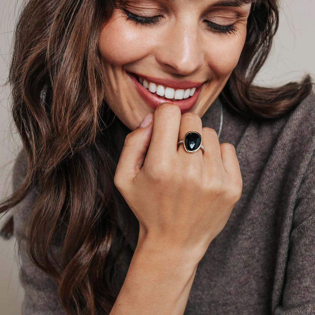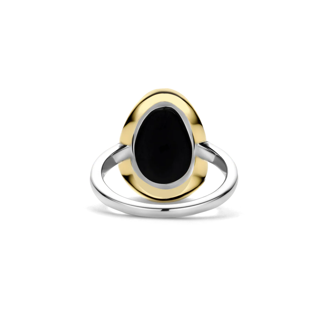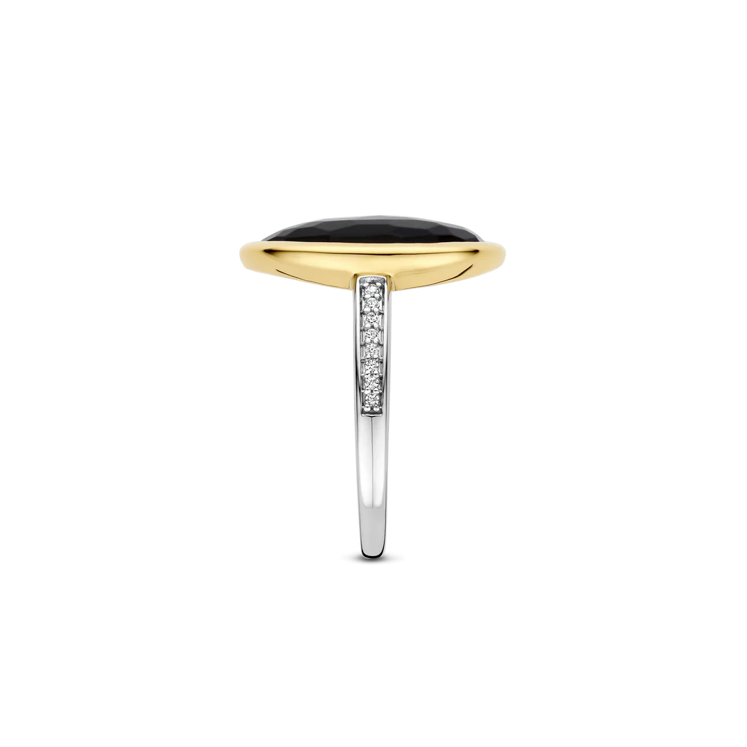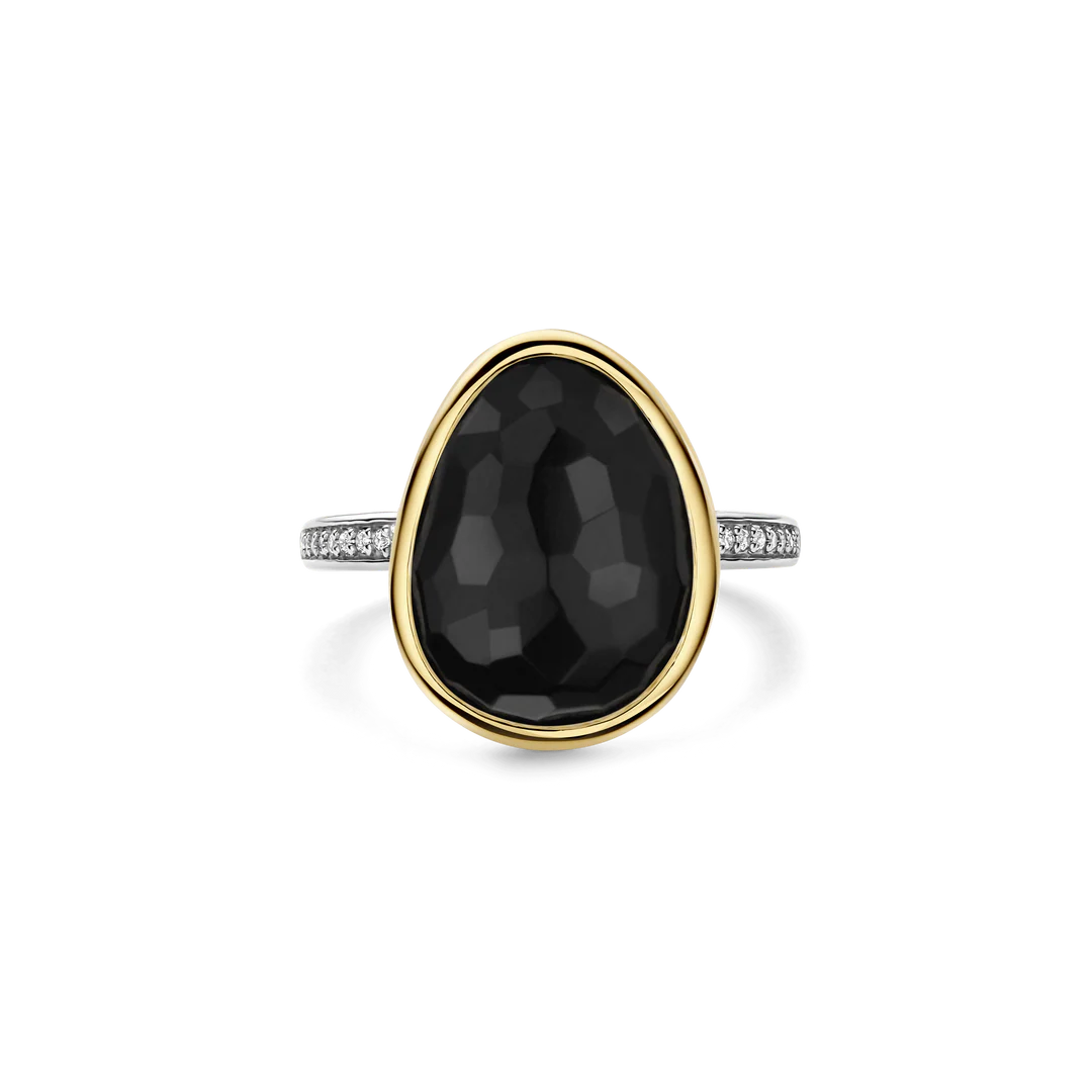Ontdek middernachtelijke allure met deze TI SENTO goudkleurig vergulde zilveren ring 12386BY. Gevormd uit 925 sterling zilver en afgewerkt met een spiegelend platinakleurig laagje, leidt de slanke band het oog naar een organisch gevormde, diepzwarte steen waarvan het gefacetteerde “pebble”-oppervlak subtiel licht weerkaatst. Een gladde goudkleurig vergulde rand omlijst de edelsteen, terwijl een taps toelopende rij van pavé-gezette witte cubic zirconia langs één zijde een verfijnde sprankeling toevoegt zonder het geheel te overheersen. Draag de ring solo voor krachtig contrast, of stapel hem met slanke metallic ringen om een zorgvuldig samengestelde glans te creëren. Nikkelvrij en hypoallergeen, dit sieraad blijft de hele dag huidvriendelijk.