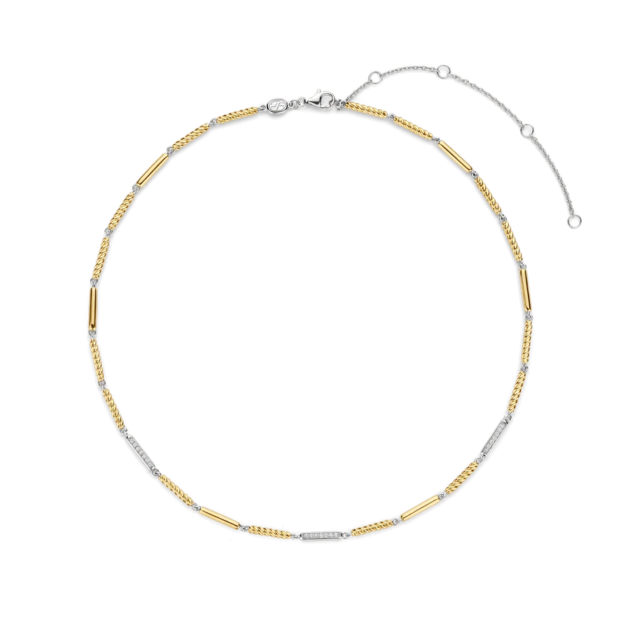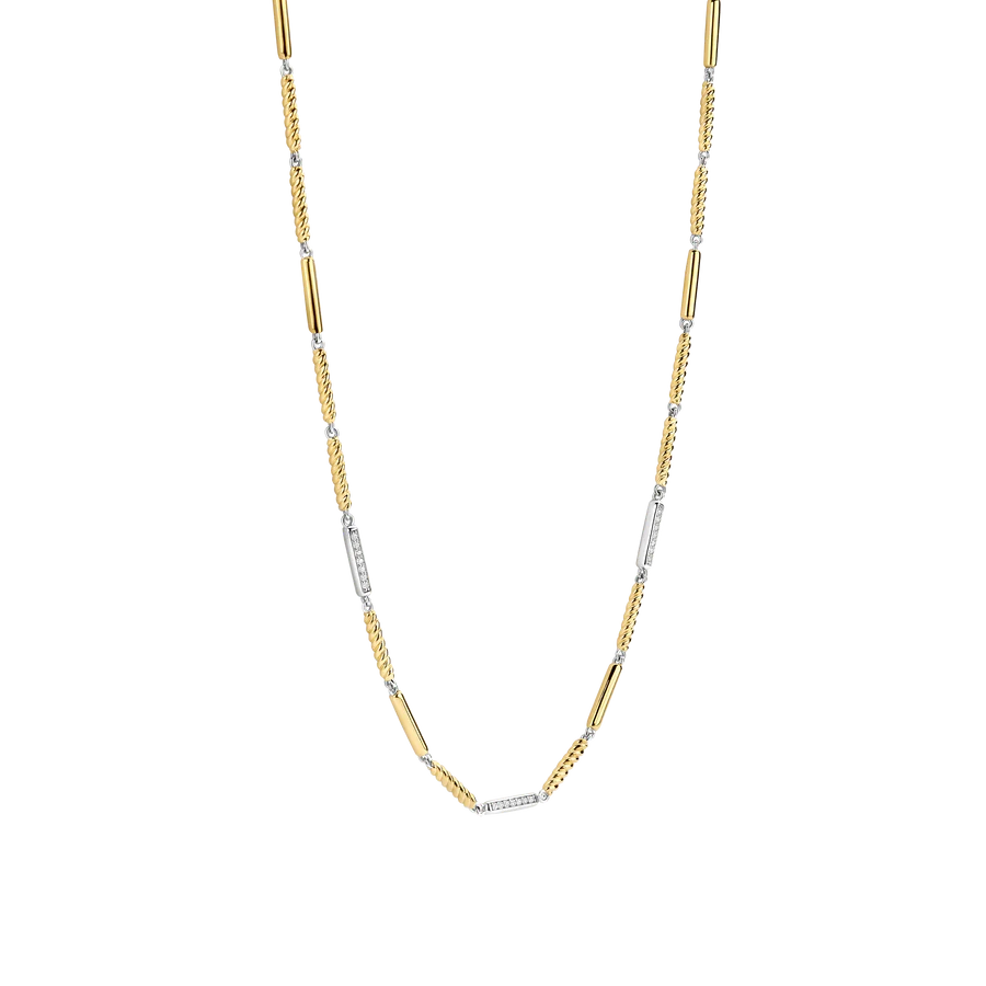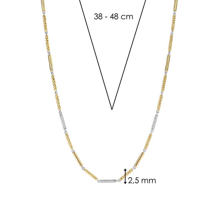 Maak kennis met de TI SENTO ketting 34088ZY, een luxueuze mix van verfijning en moderne elegantie. Gemaakt van hoogwaardig 925 sterling zilver, toont deze ketting een boeiend touwontwerp met goudkleurig gedraaide schakels en platinakleurige accenten, bezet met glinsterende cubic zirconia. De afwisselende texturen creëren een gedurfde maar gracieuze uitstraling, waardoor dit sieraad een echt statement van verfijnde stijl is. Laat deze ketting je zomerse verfijning belichamen en een vleugje gouden warmte toevoegen aan je zonnige avonturen. Draag de ketting met een diepe halslijn of combineer de ketting met andere delicate kettingen voor een veelzijdige, chique look. Hypoallergeen en nikkelvrij, biedt hij comfort en tijdloze schoonheid voor elke gelegenheid.