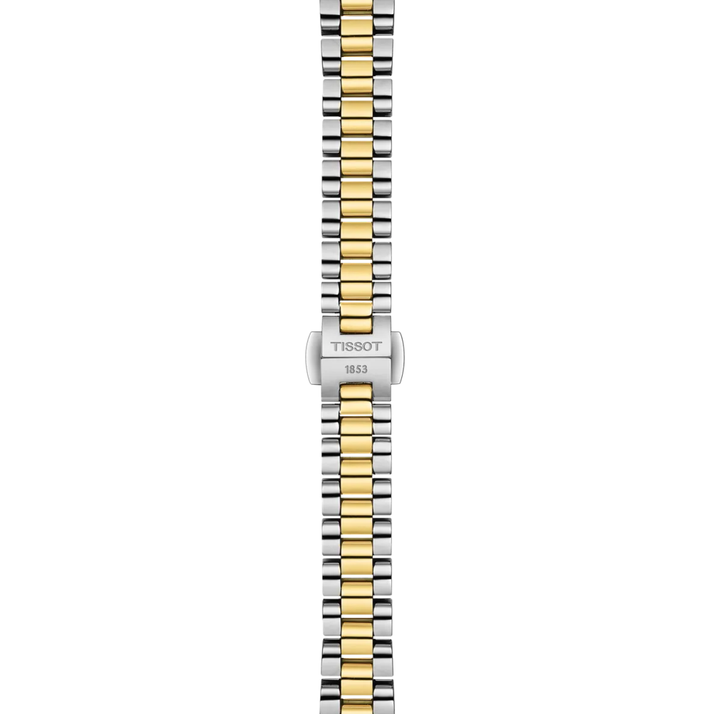 Dit Tissot bicolor stalen horloge uit de Desir collectie is uitgerust met een quartz kaliber 8"3/4 uurwerk. Het horloge heeft een stalen kast en band met geelgouden PVD-coating. De kast heeft een diameter van 28MM en is getest op een waterdichtheid van 5 ATM / 50 M. De parelmoer wijzerplaat is versierd met goudkleurige romeinse indexen.  Het horloge heeft een krasvrij saffierglas.