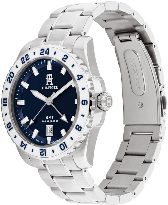 Dit horloge uit de TH85 serie is een Swiss GMT automatic horloge. Het horloge heeft een diameter van 42 mm. De band van het horloge is een schakelband. De waterdichtheid is 20ATM. Het horloge is zilverkleurig met een blauwe achter wijzerplaat. De witte rand is gemaakt van ceramiek.