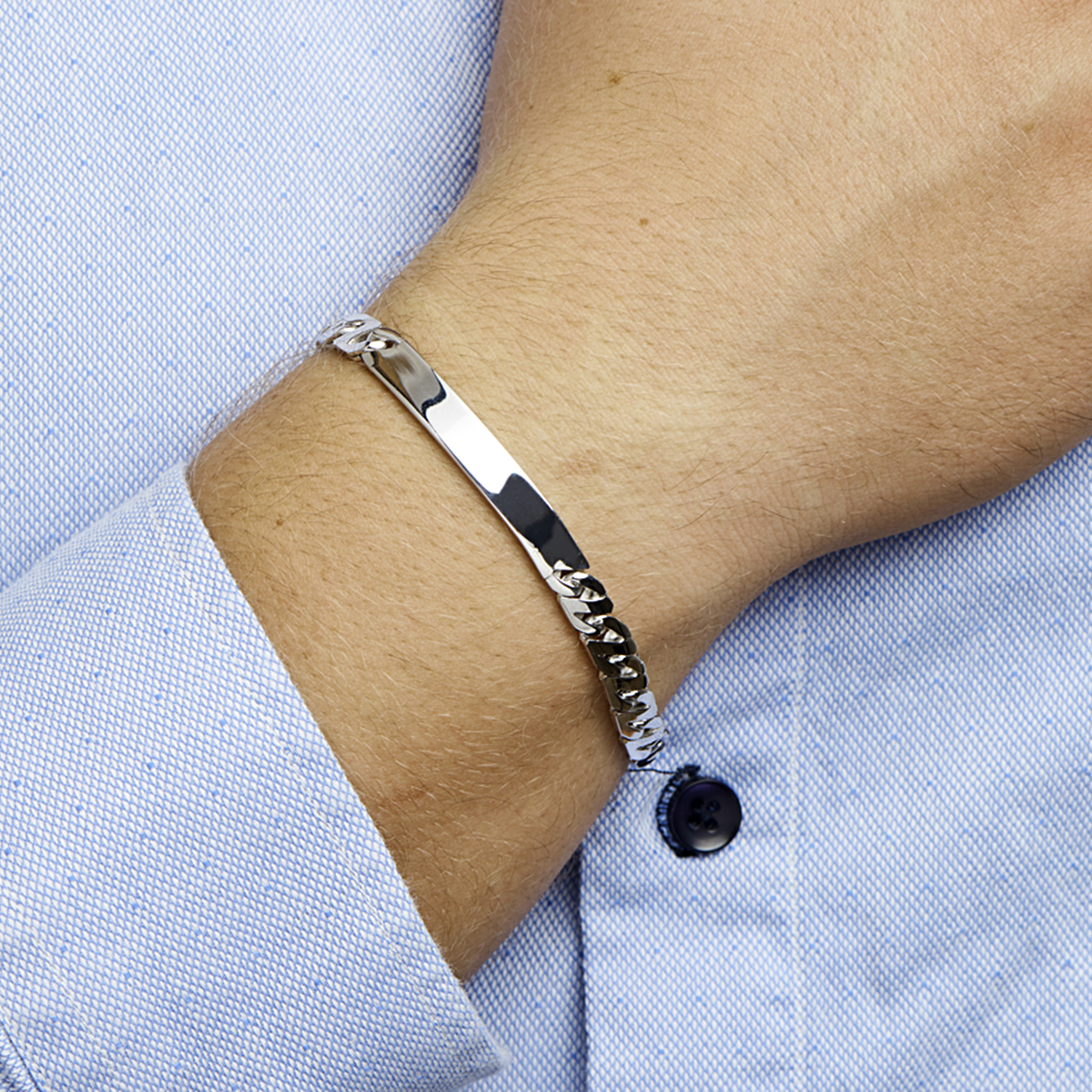 Gerhodineerd zilveren graveerarmband uitgevoerd met een stevige karabijn sluiting. De graveerplaat heeft een breedte van 6.5mm en een dikte van 2mm. De schakelbreedte is 6.5mm.