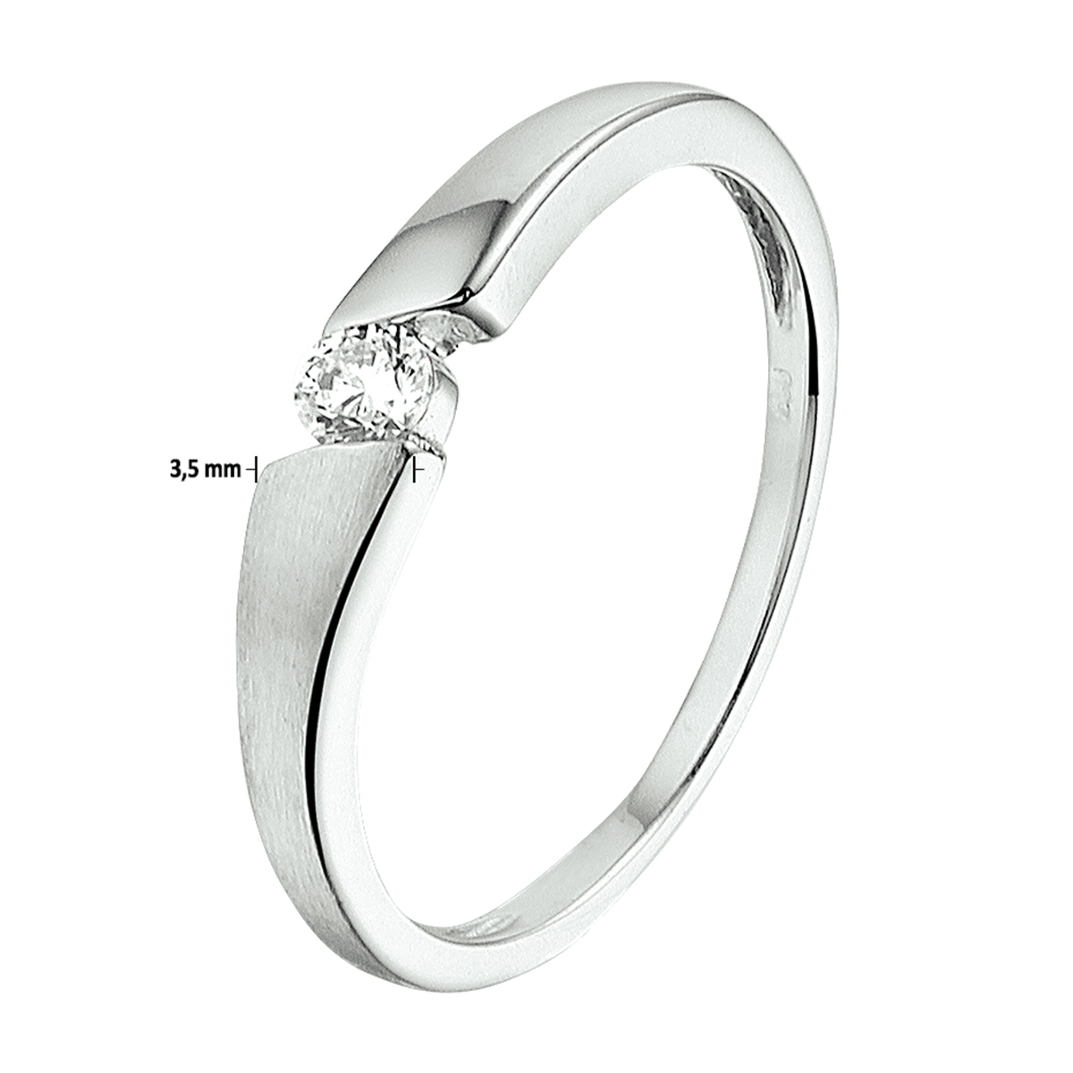 Gerhodineerd zilveren ring uitgevoerd met een heldere zirkonia. De ring heeft een poli/matte afwerking en een breedte van 3.5mm.